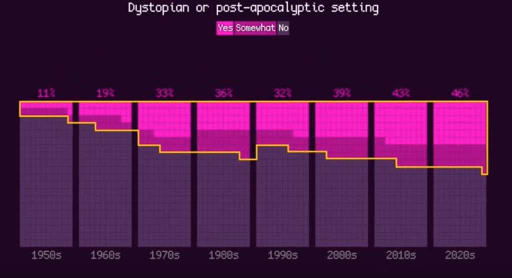 Hablar de utopías es hablar de historias del futuro, de aquellas ideales o imaginarias que cargan de sentido y orientación al presente. Un trabajo reciente de Alvin Chang (2024) analiza cómo cambió la ciencia ficción entre 1950 y 2020. Tomando 200 películas más valoradas de cada década (según valoraciones de IMBD), encuentra que las historias fueron centrándose cada vez más en el futuro. Sin embargo, este futuro es visto crecientemente de manera distópica o apocalíptica, marcado por las desigualdades, por las crisis ambientales o los autoritarismos.