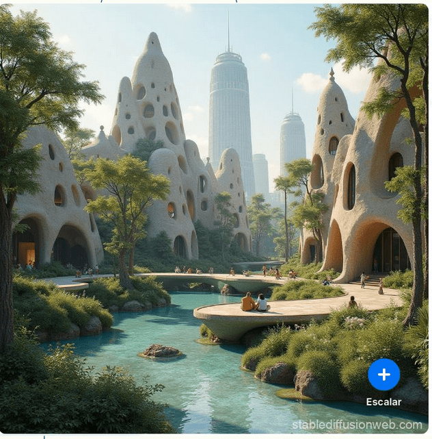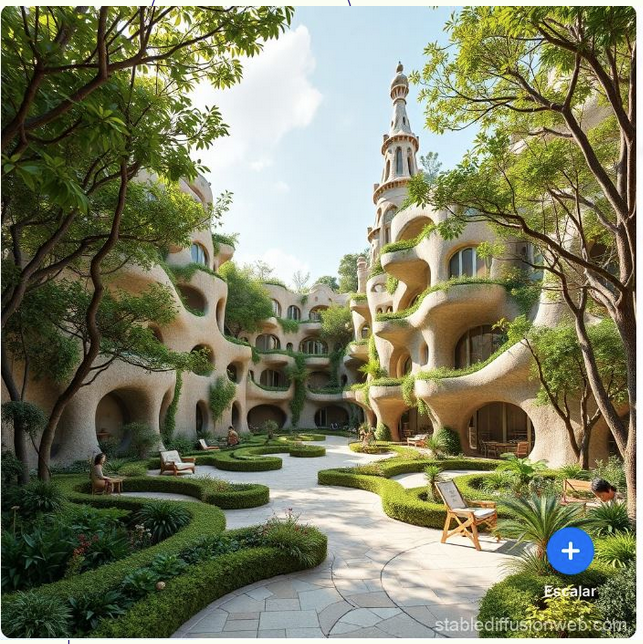 Para la imagen de la izq. se usó el prompt: Un escenario urbano y antinaturaleza, donde las tecnologías representan el progreso, con un estilo artístico de Gaudi. Incluyendo elementos ajenos al universo temático del arquitecto / Para la imag. de la derecha se utilizó: Un escenario urbano en vínculo con la naturaleza, con formas elásticas, flexibles, con un estilo artístico de Gaudi.