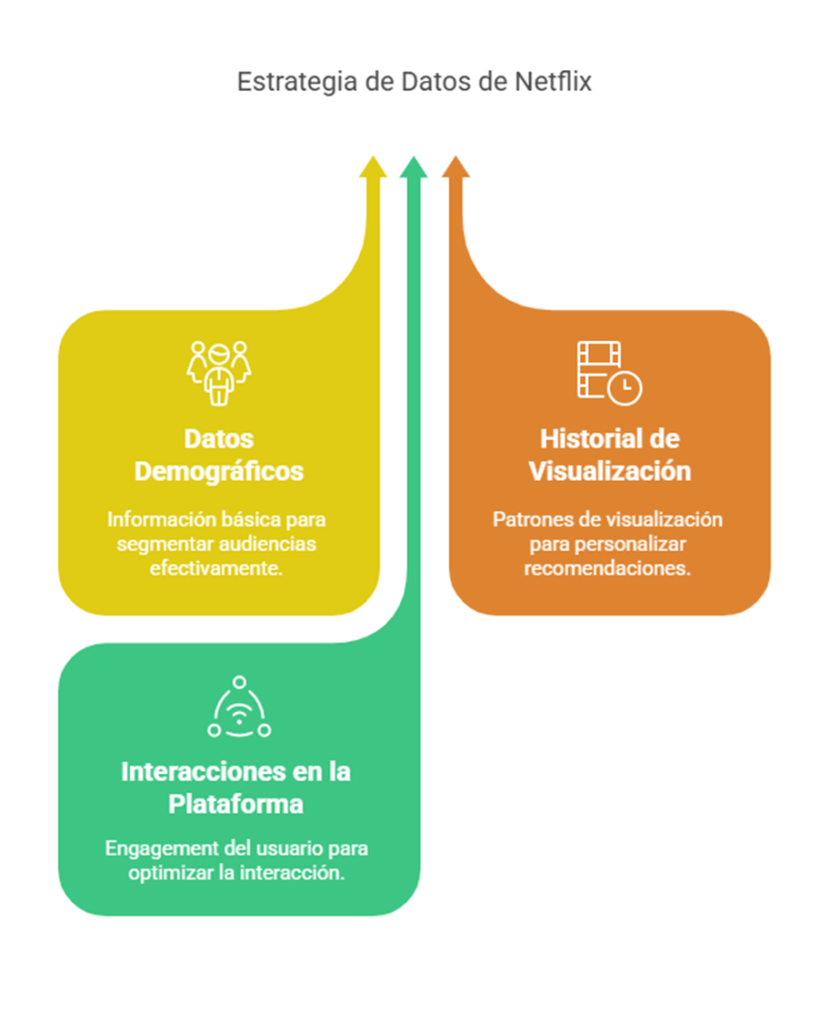 Para comprender las preferencias y hábitos de su audiencia, Netflix obtiene datos a partir de diversas fuentes. Entre las más relevantes se encuentran: