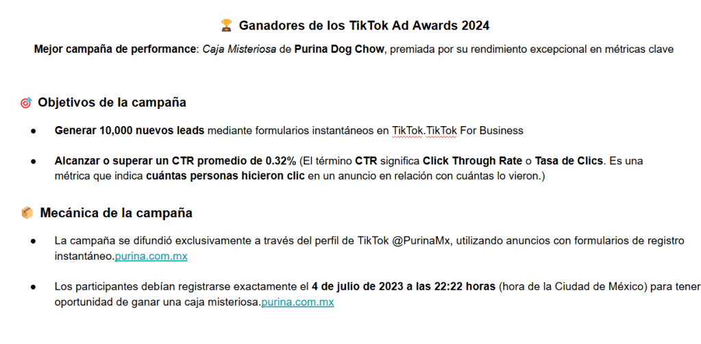 las campañas publicitarias dentro de la plataforma —como el caso premiado de Purina Dog Chow en los TikTok Ad Awards 2024— no se limitan únicamente a generar visibilidad o reconocimiento de marca. Su objetivo central es maximizar la performance algorítmica, es decir, lograr que el contenido publicitario obtenga métricas destacadas como: